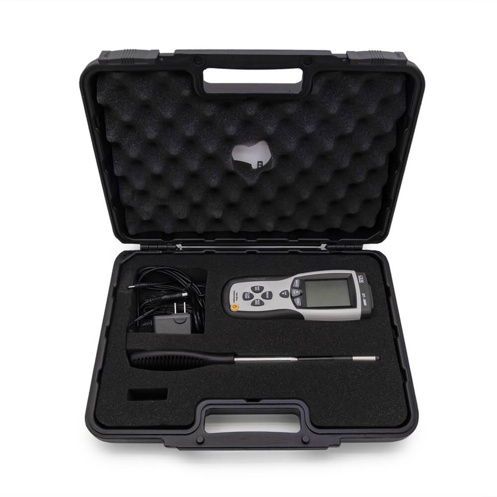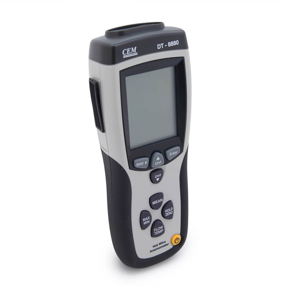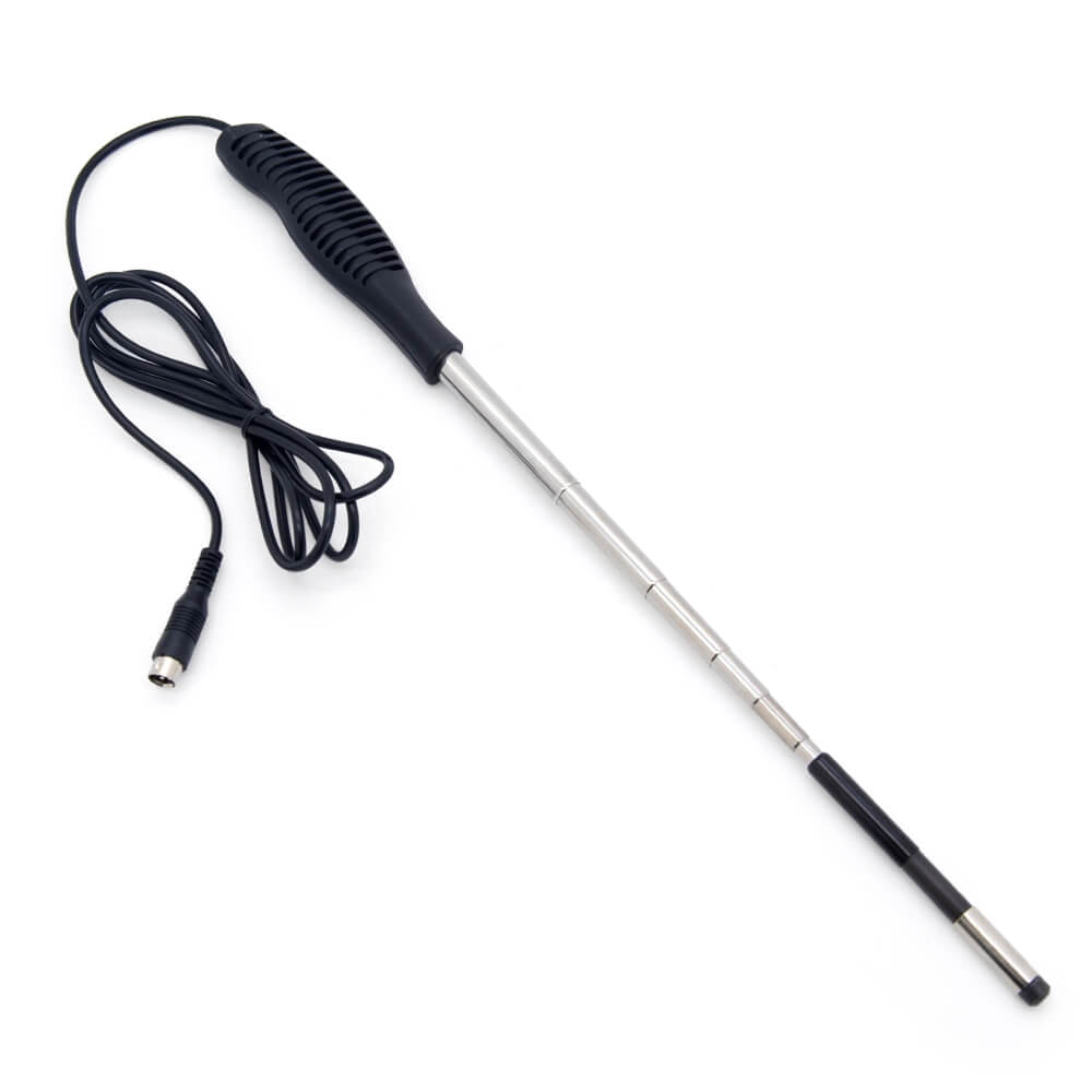 Портативный анемометр предназначен для применения в бытовых и промышленных целях для замеров характеристик вентиляционных систем. Прибор оснащен тепловым измерительным датчиком диаметром 10 мм на телескопической штанге. Такая конструкция облегчает процесс измерений в коробах вентиляционных систем. Прибор сохраняет показания, определяет максимальное и минимальное значения и расчетные характеристики, такие как средняя скорость и объем прокачанного воздуха сквозь заданное сечение. Модель отличает большой ЖК дисплей с подсветкой, простое и удобное пользование. Питание прибора осуществляется от батареи типа «Крона». Функция авто отключения выключает прибор при неиспользовании в течение 15 минут для экономии заряда батареи.