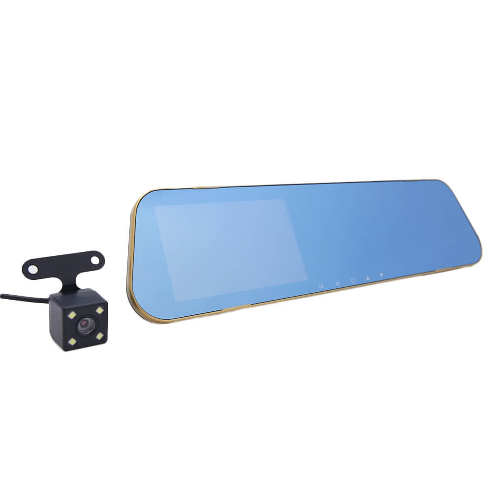Автомобильный видеорегистратор с выносной камерой, которая позволяет снимать видео с разрешением 720Р или 1080Р. Для съемки в условиях низкой освещенности устройство оснащено четырьмя светодиодами подсветки. Угол обзора камеры – 170 градусов. В зеркало заднего вида встроен дисплей диагональю 4,3 дюйма с разрешением 640x480 точек. Видеорегистратор поддерживает установку карты памяти до 32 Гб. Питается прибор от бортовой сети автомобиля.